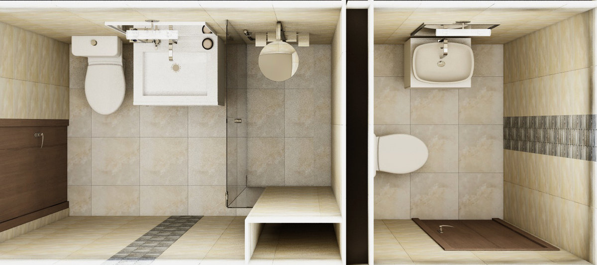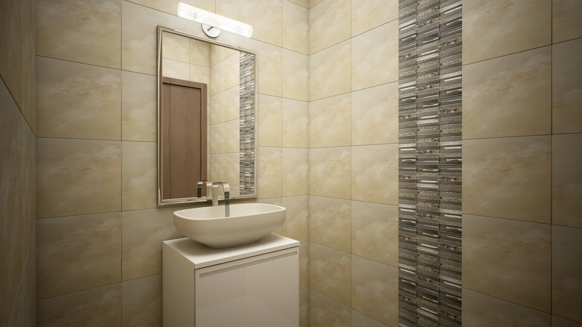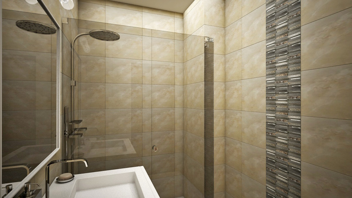 Напълно оборудвани санитарни помещения: плочки на стената и пода, раковина, душ кабина, тоалет, аксесоари.