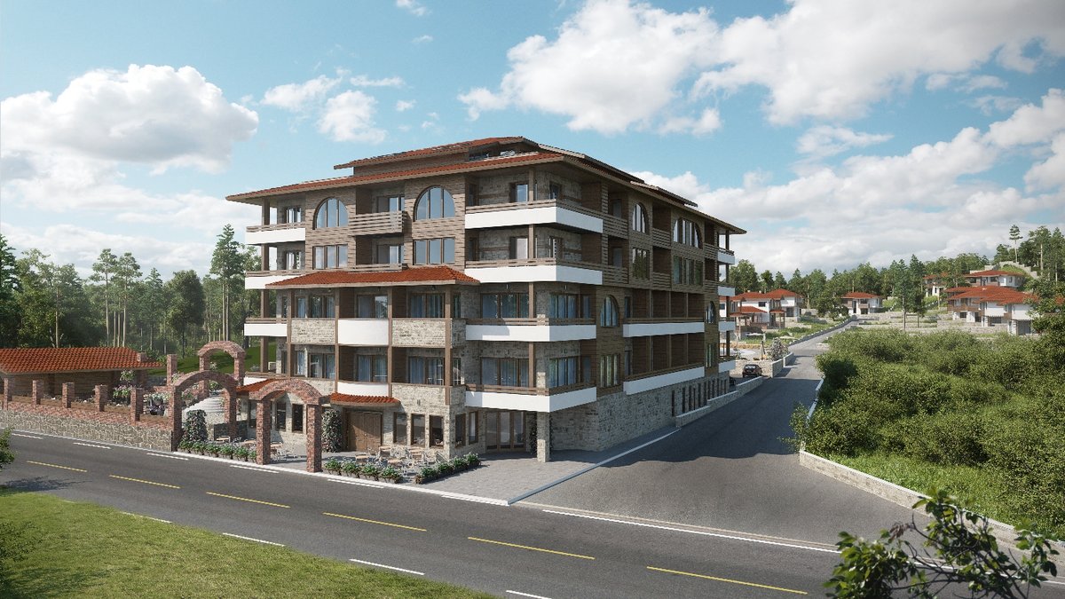 За външните фасади е предвидено използването на комбинация от гладка и декоративна замазка, облицовка от естествен камък и дърво. Външните стени и подове с топлоизолация. Покривната конструкция - дърво, керемиди “Брамак”.